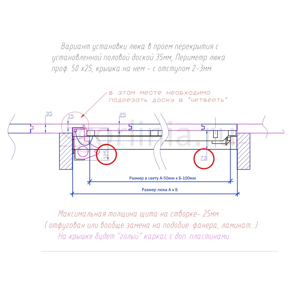Скрытый короб без наличников крепят на расчетную отметку над уровнем чистовых полов. Со стороны оси открывания на паразитку стелят деревянный пол до 35 мм с подрезкой в четверть 15 мм, отступом 4-6 мм от края полки по месту. Дверь обшивается доской 25 мм с запилом торца на угол, как на схеме, для свободного хода двери на газовых амортизаторах до угла распахивания 88° при зазоре 2-4 мм на петлевым узлом.