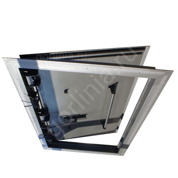 Откидная крышка закрыта сверху гладким стальным листом с загнутыми к низу краями, вылетающими на 25 мм за периметр коробки. Внутри каркаса створки между ребрами обвязки проложен рулонный минеральный утеплитель 50 мм, подшитый снизу листом 1 мм.