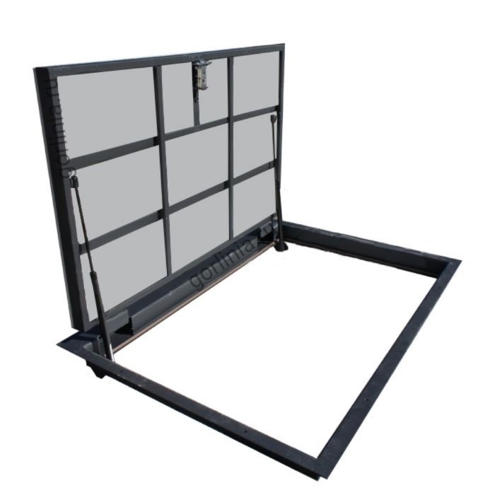 Облегченная модель с утеплителем 20 мм в дверце без щелей в полу, смещенными за ось открывания петлями. Легкая ходовая часть и удобная установка с наличником. Заполнение крышки - гипсоволокнистый влагостойкий лист, выставлен в уровень внешней полки рамы под наклейку плитки или ламината.
