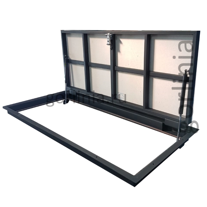 При подготовке напольного отверстия с зазором для посадки рамы 1200х600 обратите внимание на защитные кожухи шарниров и вылет полки наличника 10 мм со стороны петли. Изучите монтажные размеры на схемах в галерее.