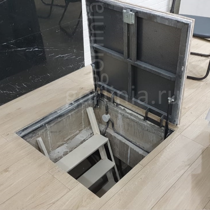 Рама без наличников выставляется в существующем отверстии 100*100 см с допусками, крепится в перекрытии через вертикальные пластины даже когда Ваш ремонт закончен и пол выложен керамогранитом или настелена ламинированная доска.