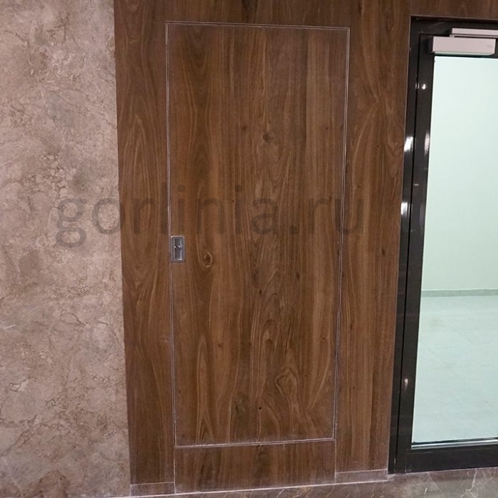 В скрытую коробку с порогом без наличника вклеена терморасширяющаяся лента, полотно на осевой подшипниковой петле заполнено минеральной плитой, закрытой листами ГВЛ и ГСП-DF.
