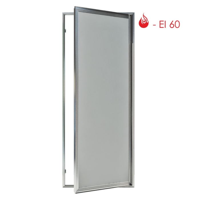 Скрытая коробка с порогом без наличника с терморасширяющейся лентой. Глухая распашная створка открывается на себя за ручку или нажатием, ходит на опорных подшипниках. Заполнена листами ГВЛ и огнеупорным ГСП-DF с прокладкой минваты ρ≥150 кг/м³. Предел огнестойкости 60 минут. Сертифицировано.