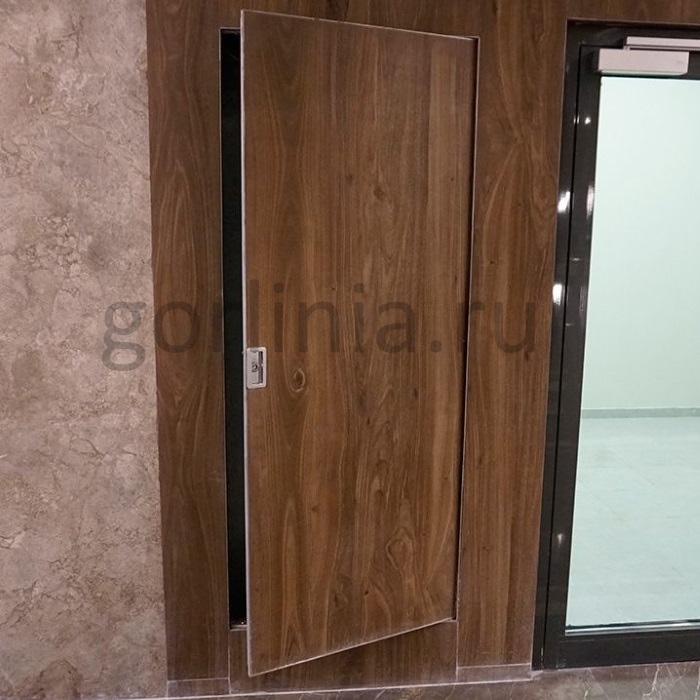 Скрытый алюминиевый короб без обкладки с порогом собирается на закладных деталях. Навес полотна выполнен на осевых подшипниковых петлях с возможностью регулировки. Заполнение листами гипсоволокна с закладкой в полость базальтовой плиты плотностью ≥150 кг/м³. В раму вклеивается огнеупорная терморасширяющаяся лента.